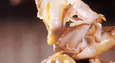 如果火候控制得好,这样做出来的白切鸡肉质极嫩,骨头周围的肉略微桃色,骨髓还是带着血的,鸡皮因浸制而变得软糯适口,皮下脂肪因为自然冷却而微微凝结。潮州老乡蔡澜大师当然深谙老广此道,他的描写是:“白切鸡绝对不能全熟。全熟的肉就像是烂布,完全吃不出鸡的香味;懂得吃鸡的人,最享受那层皮。所谓的鸡皮不肥不好吃,皮和肉之间有一层喱状的胶汁最上乘。吃鸡的皮,吸鸡骨中的髓,大乐也。”