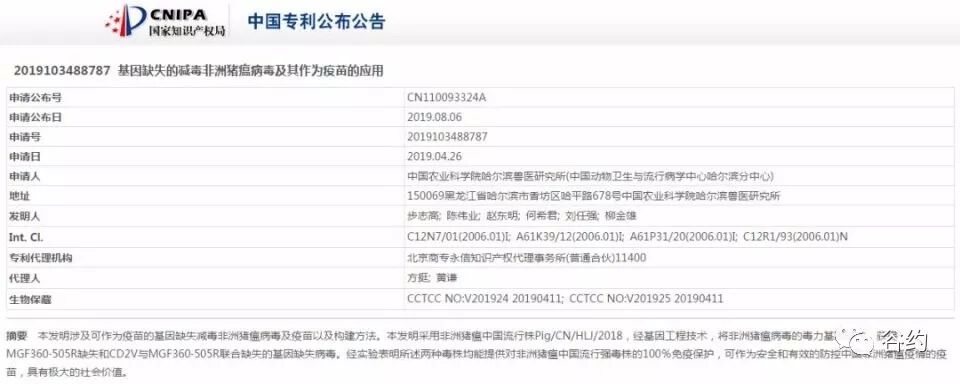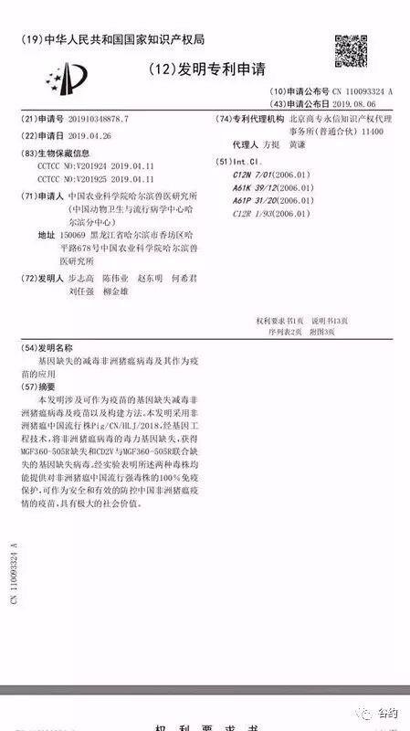 根据国家知识产权局公告,中国农业科学院哈尔滨兽医研究所(中国动物卫生与流行病学中心哈尔滨分中心)于2019年4月26日提交发明申请专利,发明名称:基因缺失的减毒非洲猪瘟病毒及其作为疫苗的应用。发明人:步志高 陈伟业 赵东明 何希君 刘任强 柳金雄。并于2019年8月6日申请公布。