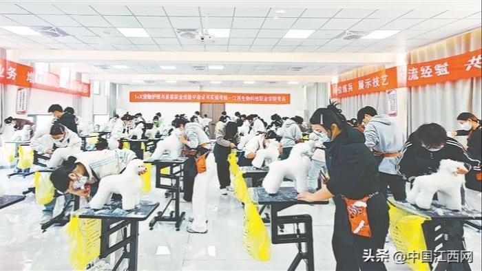 11月30日,江西生物科技职业学院学生正在参加“1+X”宠物护理与美容职业技能等级证书实操考核。(受访单位供图)